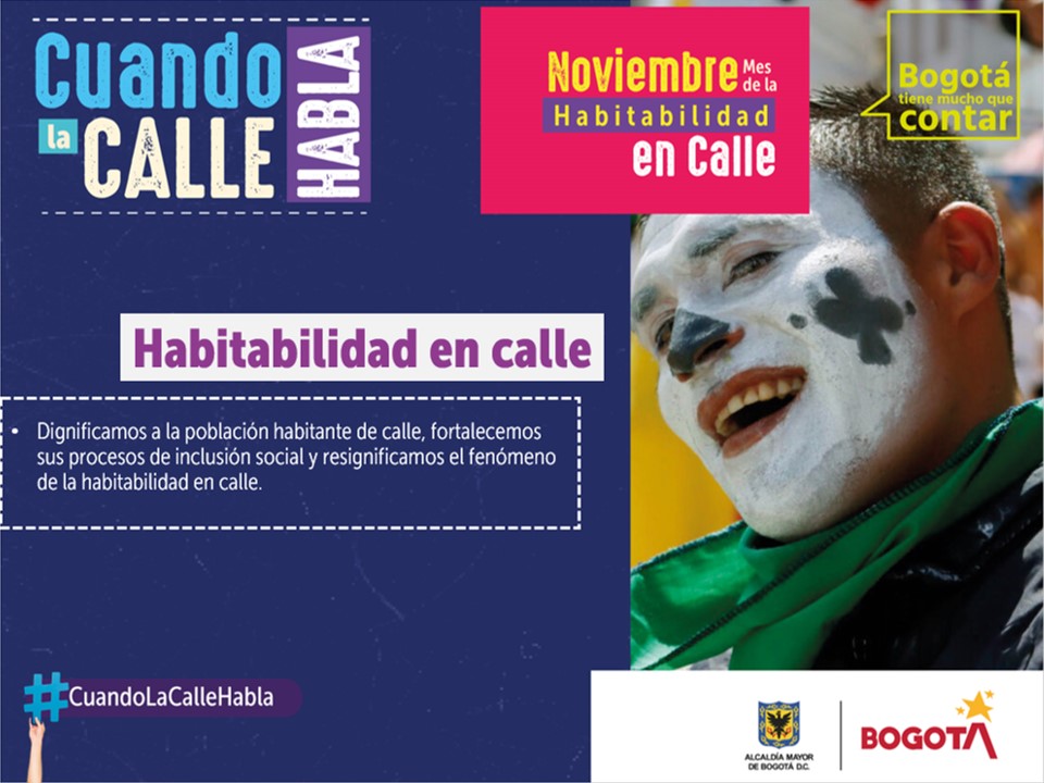 Con el lema: #CuandoLaCalleHabla, la Secretaría de Integración Social llevará a cabo una amplia programación de actividades deportivas, académicas y culturales con el inicio de la nueva edición del Mes de la Habitabilidad en Calle. Con estas acciones de movilización se pretende aportar a la visibilización y dignificación de las y los ciudadanos habitantes de calle.