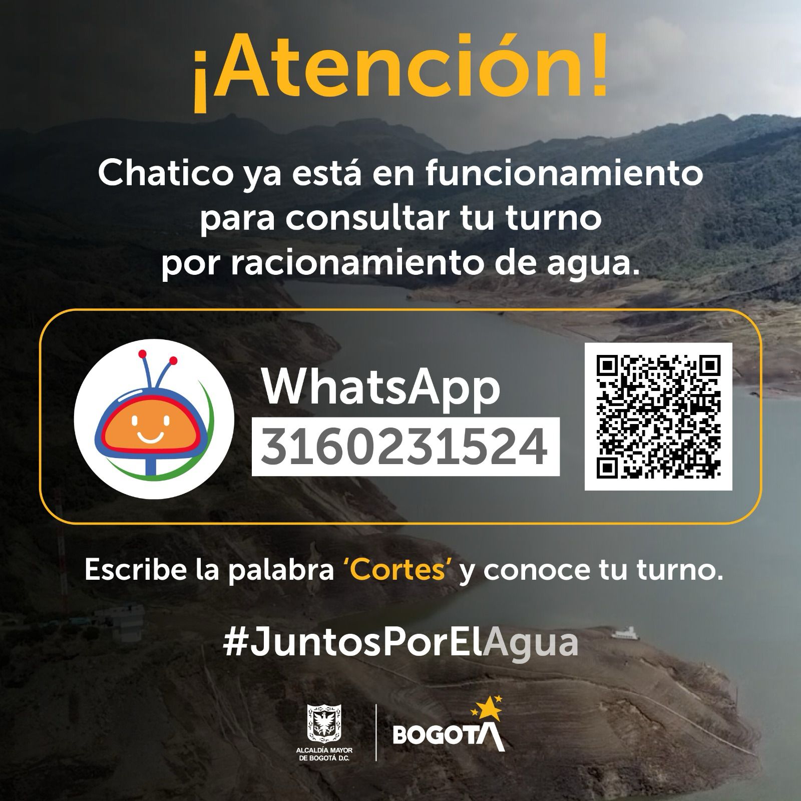 Recuerda que puedes consultar el turno programado para el corte o racionamiento de agua en los barrios, localidades o zonas a través de Chatico, el agente virtual de la ciudad.