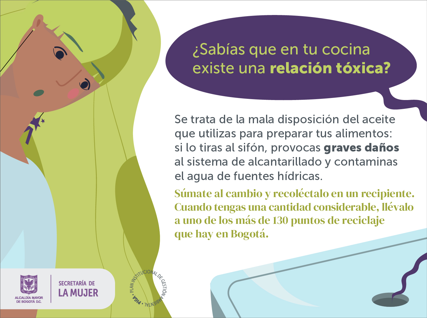 ¡No tires el aceite de cocina al sifón! Contamina el agua de las fuentes hídricas y causa graves daños al sistema del alcantarillado.