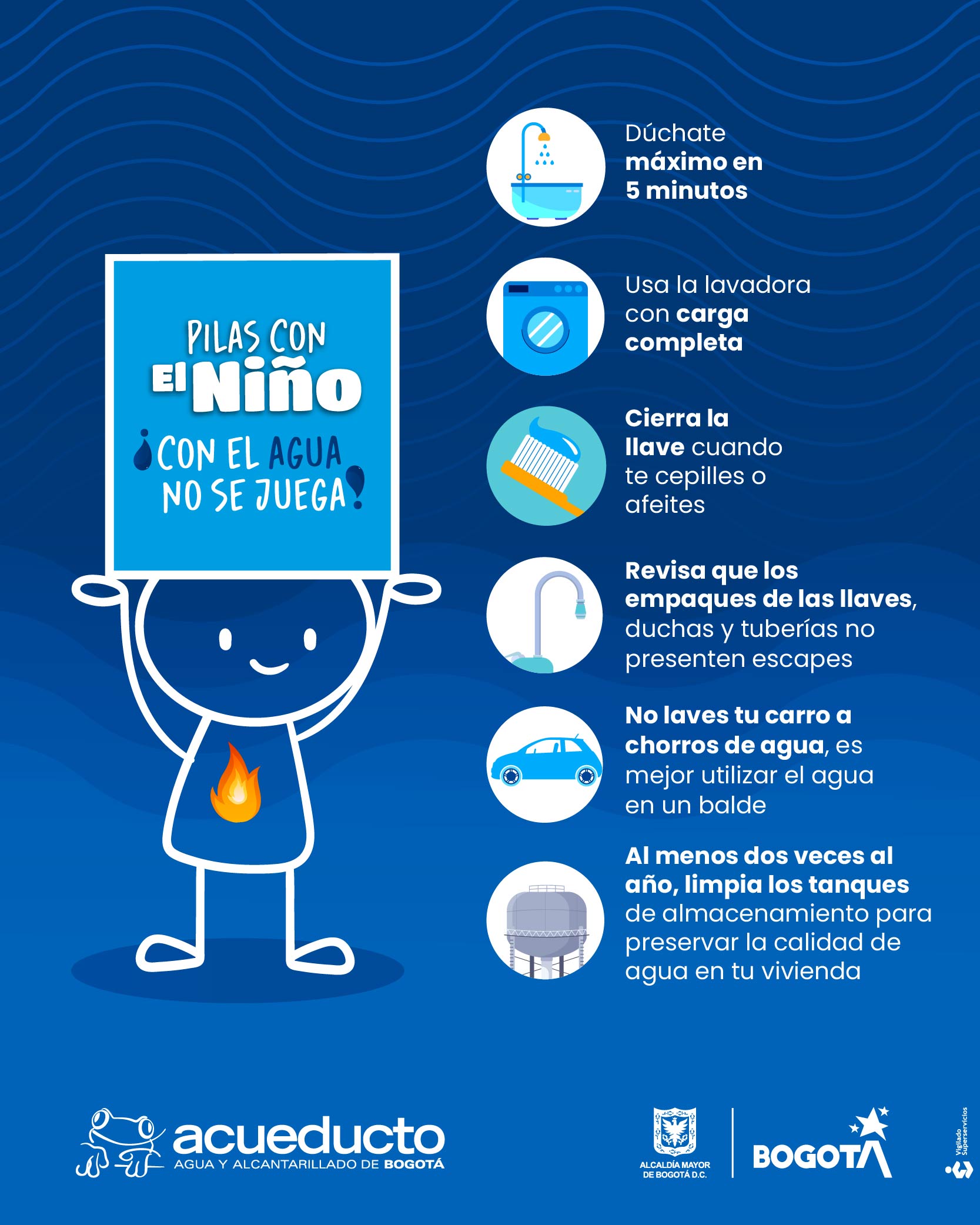 El Distrito hace un llamado a la ciudadanía a hacer uso razonable del agua en esta época del Fenómeno de El Niño, para lograr pasar esta situación de sequía sin afectaciones en la prestación del servicio de este líquido vital en la ciudad. Es fundamental que entre todas las personas desarrollemos acciones para su cuidado.