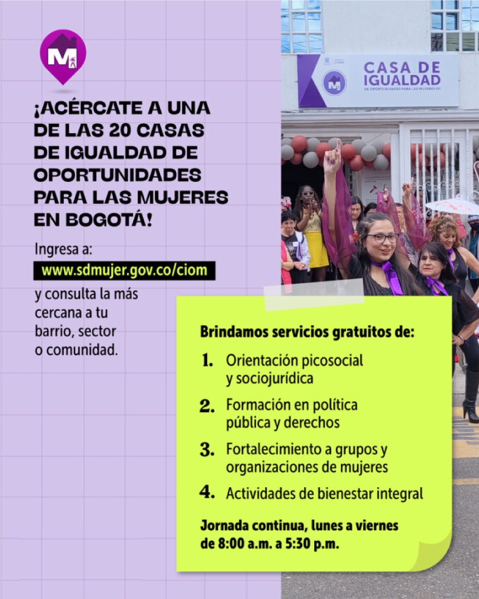 La Secretaría Distrital de la Mujer te invita a participar en las 20 Casas de Igualdad de Oportunidades para las Mujeres (CIOM). El equipo de profesionales está listo para brindarte asesoría sociojurídica, orientación psicosocial y una variedad de actividades gratuitas de lunes a viernes, de 8:00 a.m. a 5:30 p.m
