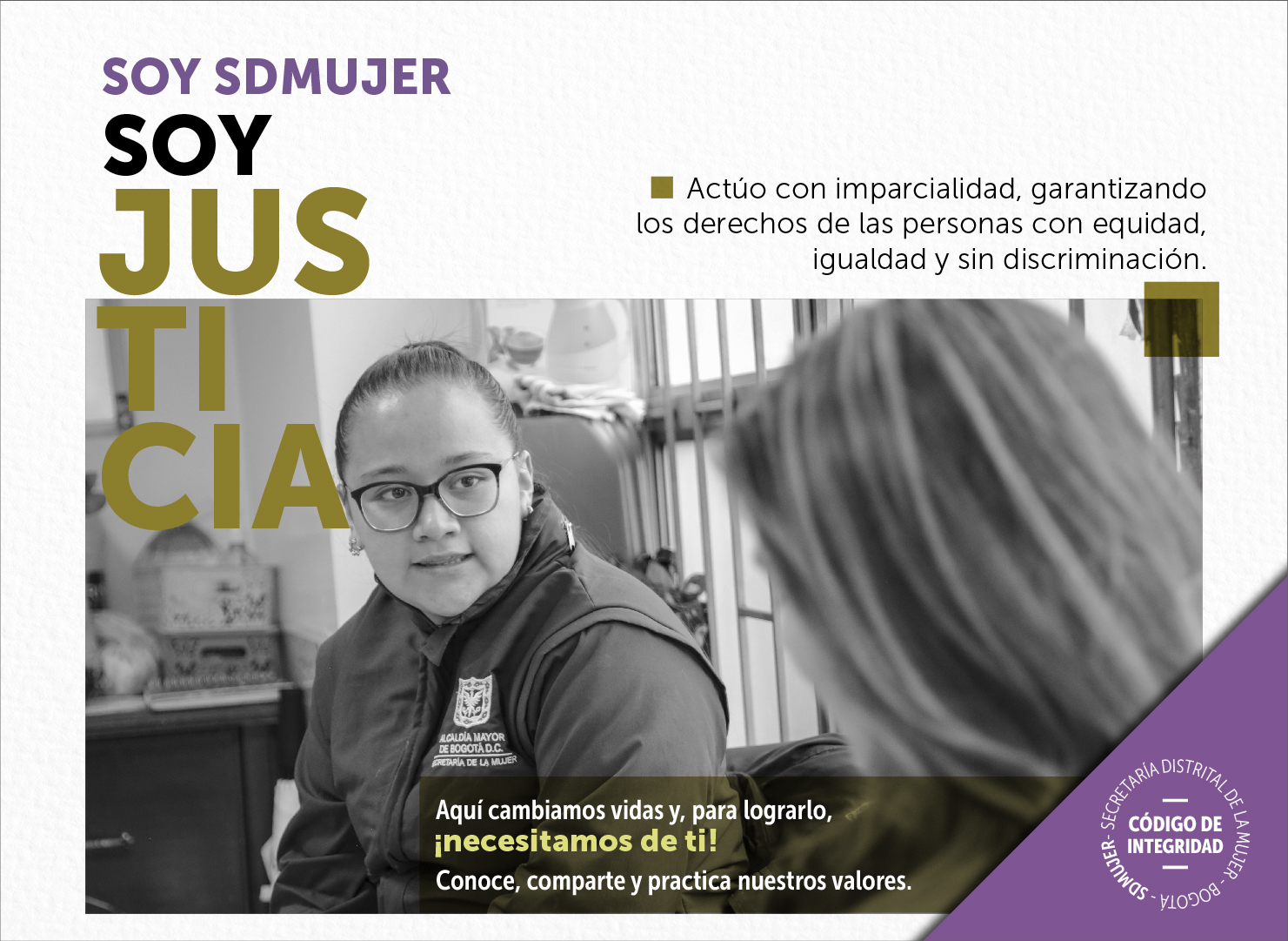 Compromiso, respeto, justicia, igualdad, diligencia, sororidad y honestidad. Esos son los valores que guían nuestro trabajo para cambiar vidas. Te invitamos a conocer, compartir y practicar nuestro Código de Integridad, el cual se actualizó mediante comité de MIPG el pasado 27 de diciembre de 2023.