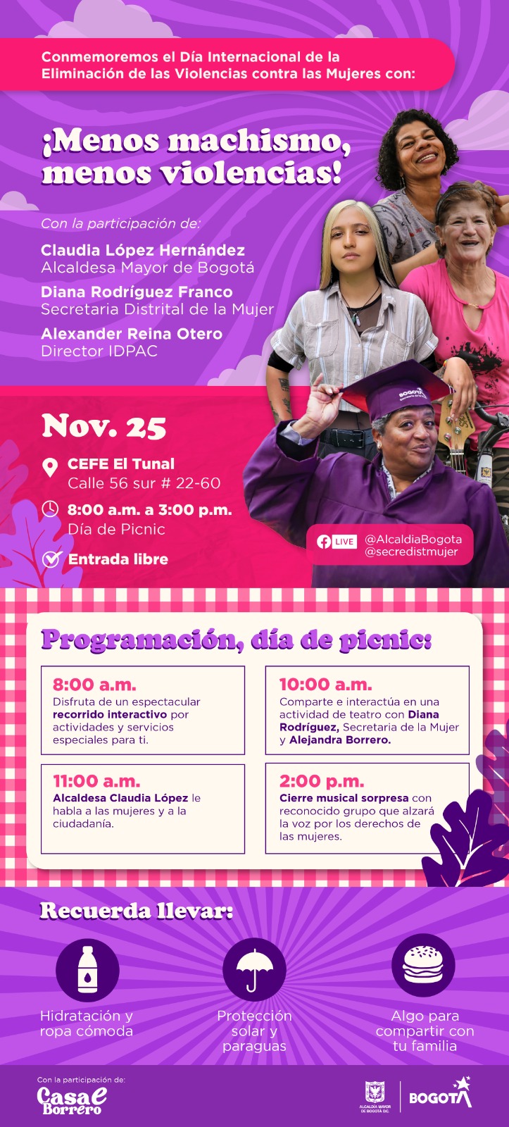 En esta oportunidad, Bogotá levantará la voz para rechazar cualquier forma de violencia contra las mujeres en un evento que reúne diferentes actividades para compartir en familia: entre ellas disfrutar de un picnic al aire libre, talleres para la eliminación del machismo y se podrá presenciar una puesta en escena con Alejandra Borrero y el gran homenaje musical a las mujeres que han sido víctimas de violencias.
