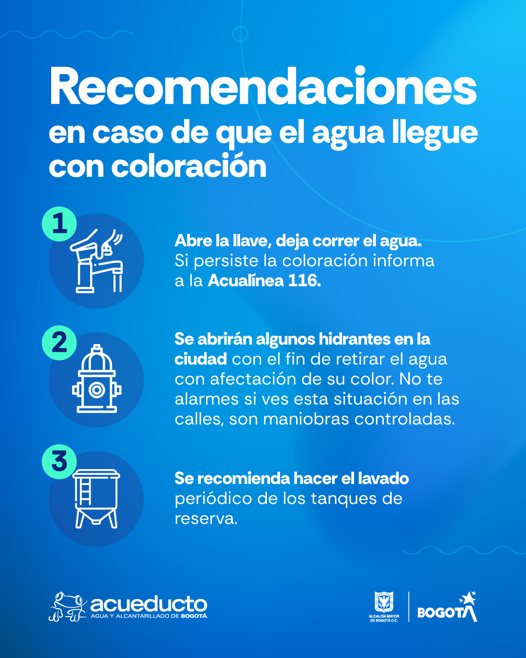- Se abrirán algunos hidrantes en la ciudad con el fin de retirar el agua con afectación de su color. No te alarmes si ves esta situación en las calles, son maniobras controladas.