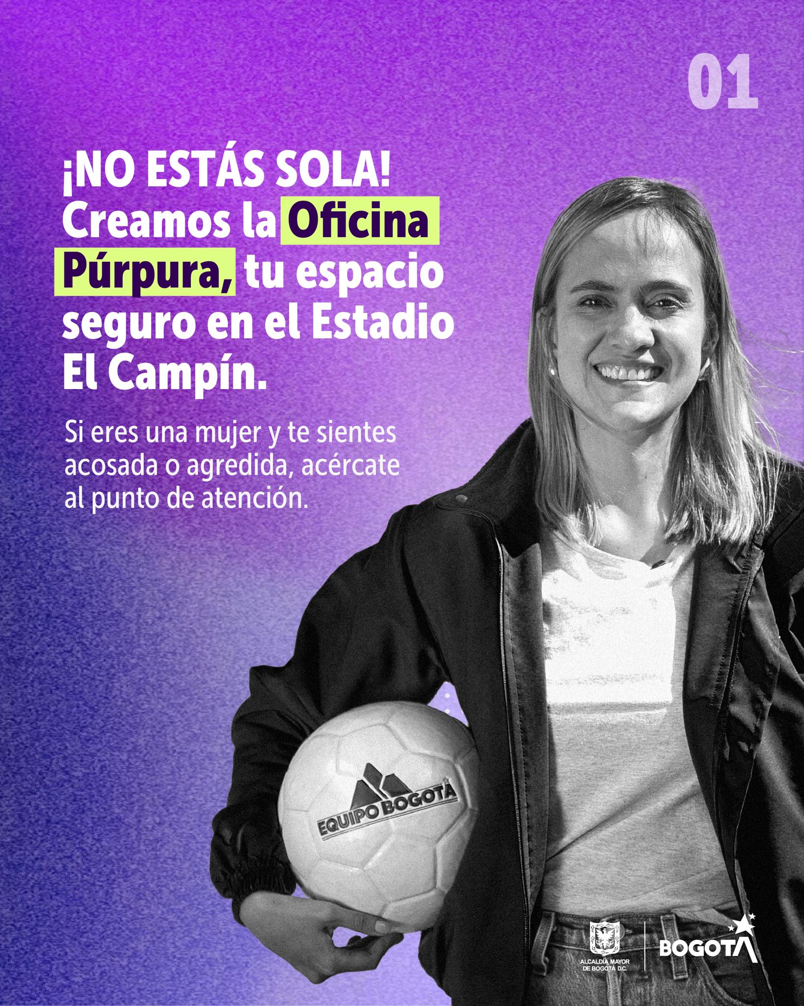 A partir de este domingo 21 de enero y durante toda Liga Bet Play, en un trabajo en equipo entre las secretarías de la Mujer y Gobierno y la Policía Metropolitana de Bogotá, contamos con la nueva #OficinaPúrpura, un espacio para orientar a las mujeres víctimas de violencias.