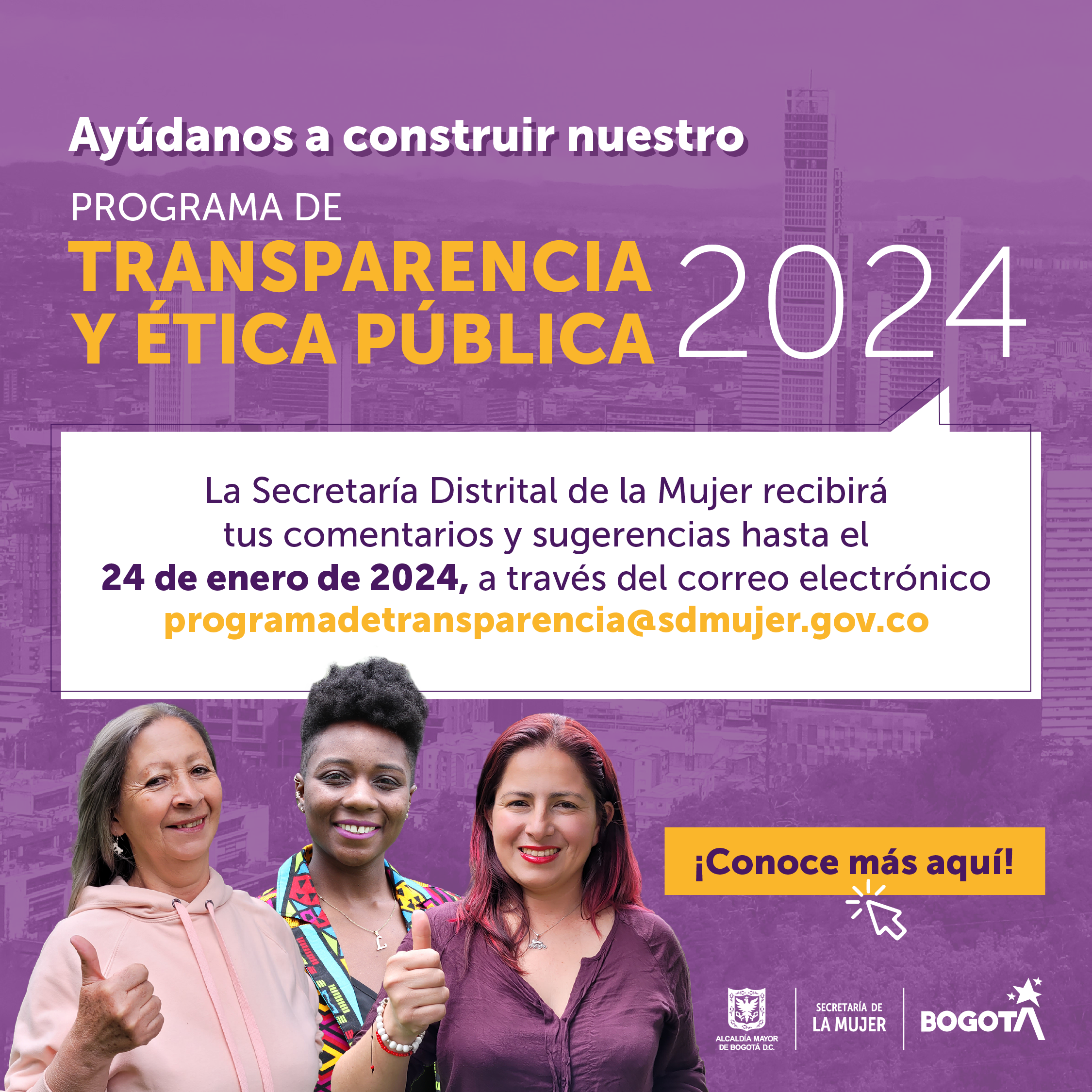 Si tienes comentarios, puedes enviar tus observaciones hasta el 26 de enero de 2024 a los correos ydaza@sdmujer.gov.co o jvera@sdmujer.gov.co.