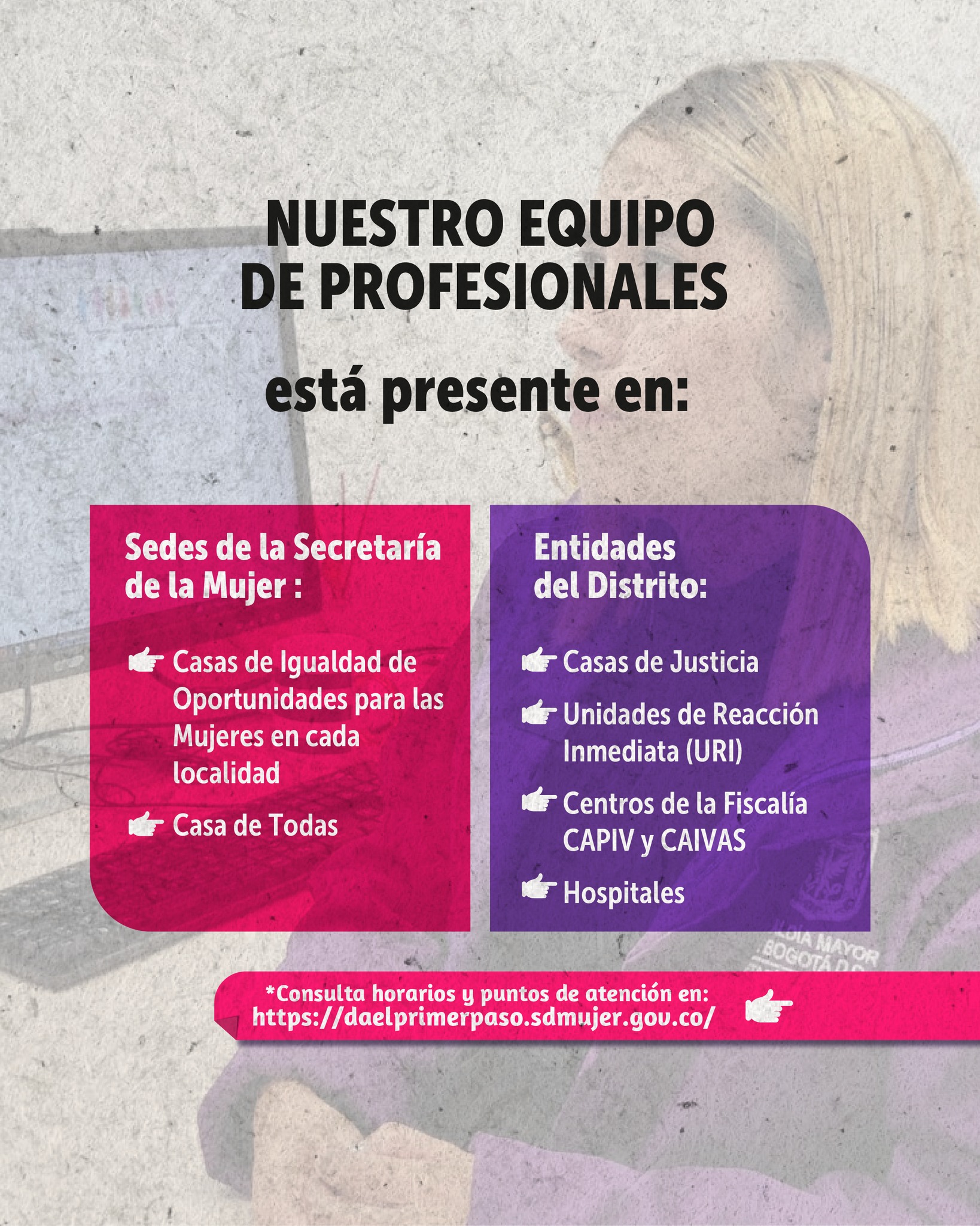 En Bogotá, ninguna mujer está sola. Contamos con un equipo de profesionales listas para atender tu caso en diferentes sedes y entidades del Distrito.