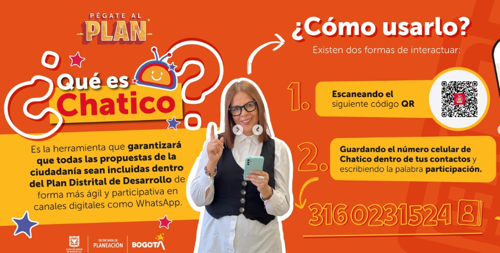 Participar es muy fácil: escanea el código que aparece en la imagen o agrega a tus contactos de WhatsApp el número 3160231524 y sigue los pasos que te mostrará Chatico, el aplicativo amigable que la Secretaría de Planeación ha creado.